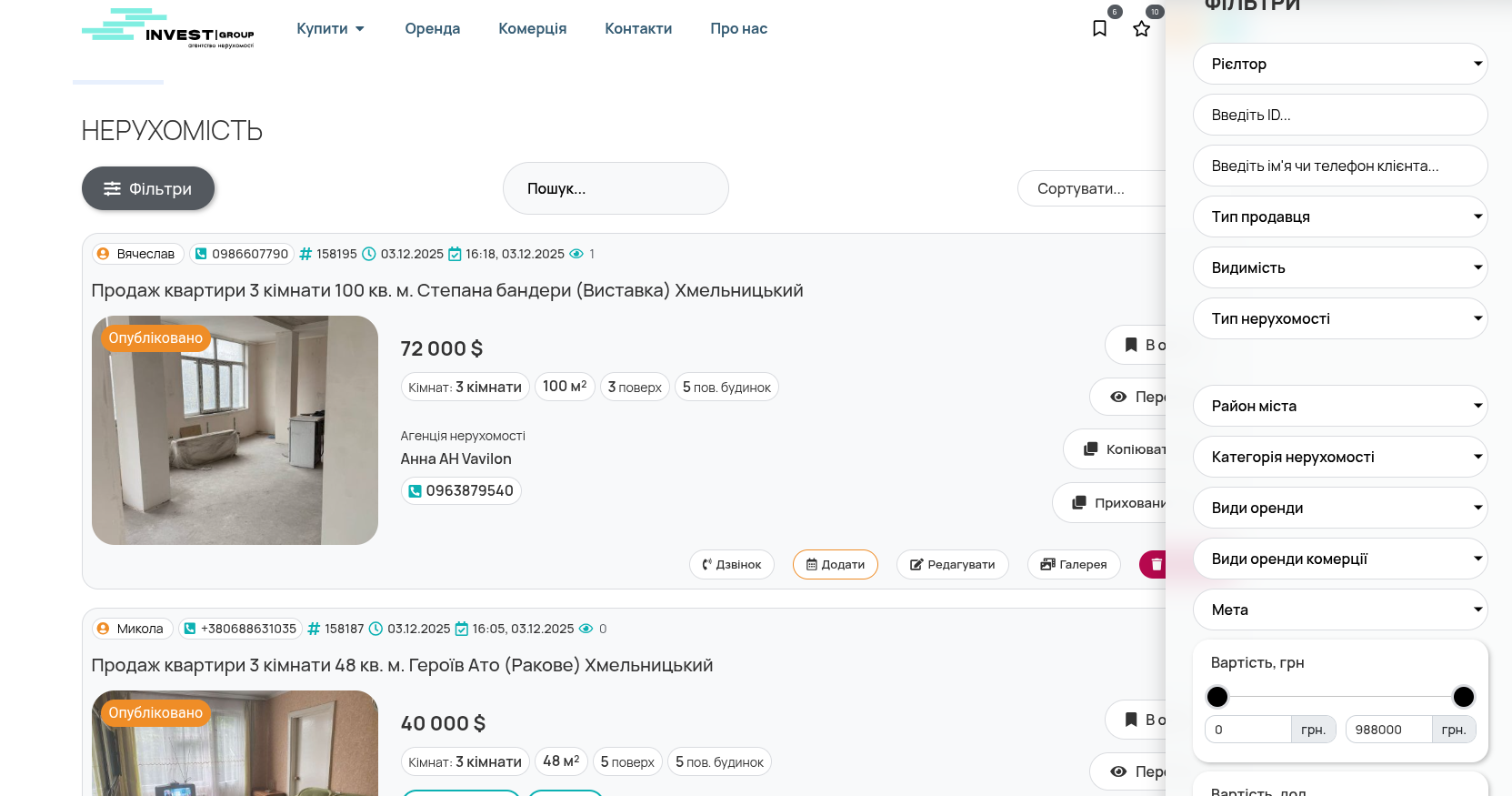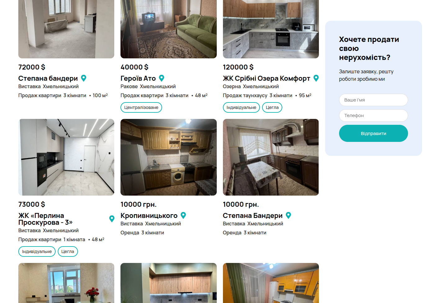 Публічна частина сайту дозволяє відвідувачам швидко переглядати нерухомість за фільтрами, вивчати детальні описи, порівнювати об’єкти та миттєво зв’язуватися з рієлтором.